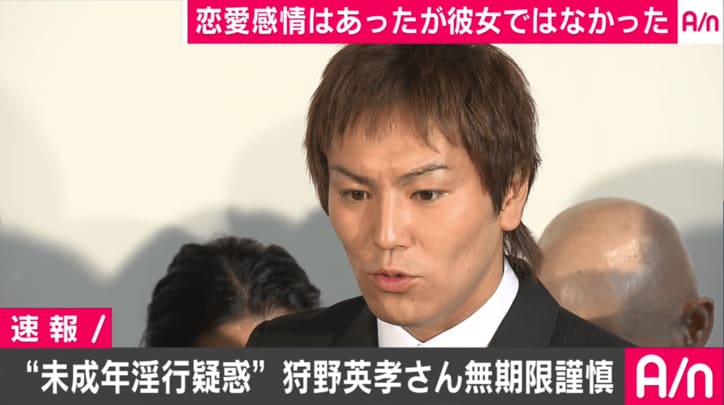 「恋愛感情はありました」“淫行疑惑”の狩野英孝、無期限謹慎へ 2019/10/24 21:28 拡大する 写真週刊誌「FRIDAY」(20日発売)に17歳の女子高生との"淫行疑惑"を報じられたことを受け、21日、狩野英孝(34)が記者会見を開き、芸能活動継続の意志はあるものの、無期限謹慎することを明らかにした。 「FRIDAY」の記事によると、同誌の取材に対し、女性から22歳だと聞かされていたとし、昨年11月に17歳だったことを知ってからは会っていないと回答していた狩野。会見でも同様の説明を行った。 会見場に黒のスーツに黒いネクタイで現れた狩野は「この度はお騒がせして誠に申し訳ございませんでした。記事にあったとおり、SNSを通して、22歳と聞いて知り合いました。その後、友人関係を経て、大人としてお付き合いさせていただきました。記事に載っていた写真は私です。二人で会うこともありました。家に来たこともありました。しかし、彼女の口から10代と打ち明けられ、自分も驚き、彼女と相談し、友人関係に戻ることになりました」と、神妙な面持ちで話し始めた。 続きを読む