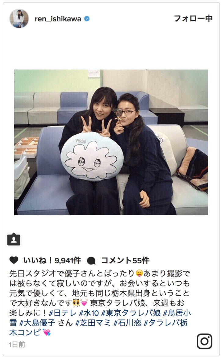 石川恋、同郷の大島優子と2ショット「いつも元気で優しい」 2019/10/24 21:28 拡大する 女優の石川恋(23)が自身のブログとInstagramで、ドラマ『東京タラレバ娘』(日本テレビ系)で共演した大島優子(28)とのツーショットを公開している。石川恋オフィシャルブログよりキャプチャ 石川は現在放送中の『東京タラレバ娘』の第2話(1月25日放送)で、主人公の吉高由里子(28)を慕っているドラマADいう役で登場。金髪ギャルを演じていたが、22日放送の第6話では黒髪になったことが話題だ。一方の大島は、吉高の親友で居酒屋の看板娘役。 続きを読む