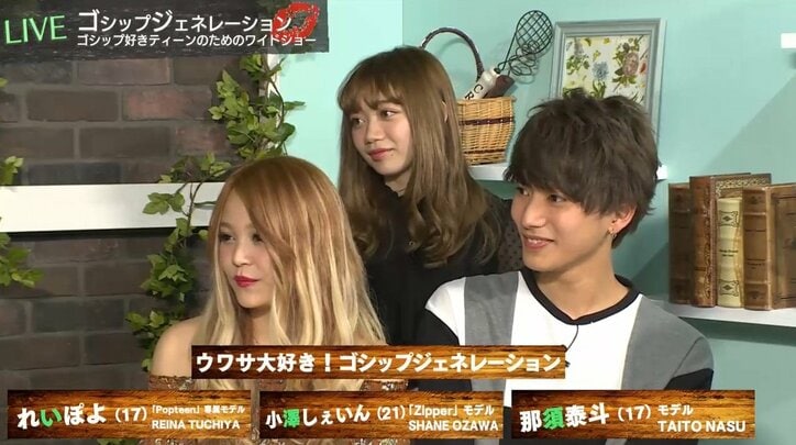 24日、AbemaTVでゴシップ好きティーンのためのワイドショー『ゴシップジェネレーション』が放送された。番組にはティーン枠としてモデルの小澤しぇいん(21)、「れいぽよ」こと土屋怜菜(17)、那須泰斗(17)の3人が出演。芸能リポーター・井上公造氏(60)と駒井千佳子氏(51)とともに興味のある芸能ネタを掘り下げたのだが、この中でティーン3人の意外な一面が明らかになった。
