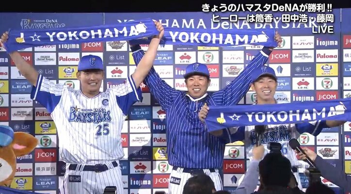 横浜DeNA筒香嘉智 戦列復帰戦での完璧弾に「もう体は問題ない」 2019/03/15 09:36 拡大する 横浜DeNAが5月23日、対中日10回戦に9対4で逆転勝ちした。戦列復帰後即ホームランという満点回答を叩き出した主砲の筒香嘉智外野手(25)は、「もう体のほうは問題ない」と断言。さらなる活躍を誓った。2014年以来となる移籍後初勝利をあげた藤岡好明投手(32)、6回に勝ち越しタイムリーを放った田中浩康内野手(34)とともに臨んだヒーローインタビューの内容は以下の通り。【筒香】―ナイスバッティングでした。 続きを読む