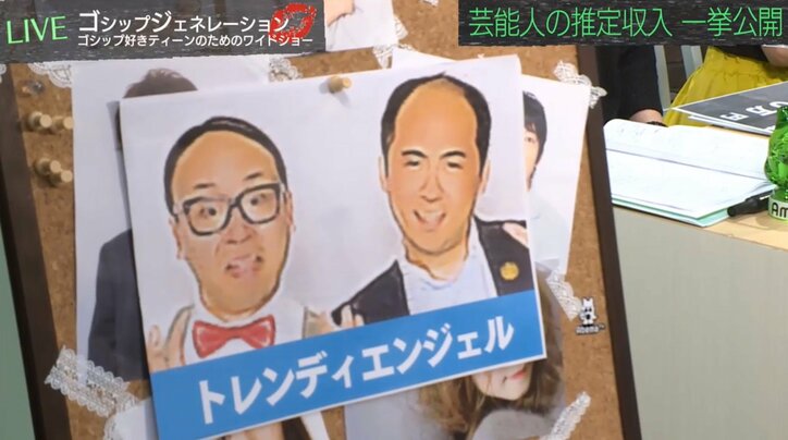 トレンディエンジェル 2016年のギャラは営業だけで5600万円? 2019/03/15 09:36 拡大する 毎週月曜日18時~放送のゴシップ情報番組『ゴシップジェネレーション』(AbemaTV)の12日放送回に、モデルのレイモンド愛華(14)が初登場。那須泰斗(17)、佐藤ノア(19)らとともに、芸能リポーターの長谷川まさ子(54)&あべかすみ(57)から、“まだ世に出ていない速報ゴシップ”を聞き出した。 同番組は、MCを俳優の南圭介(31)、番組兄貴分としてお笑いコンビ・うしろシティの金子学(36)と阿諏訪泰義(34)が務め、ベテラン芸能リポーター陣が、芸能リポーターだからこそ知っている情報を伝えるゴシップ情報番組。芸能界のゴシップが好きな若者たち(「ゴシップジェネレーション」、略して「ゴシジェネ」)が、“素朴なギモン”で芸能リポーターたちに根掘り葉掘り質問をぶつけるのが見どころの一つになっている。 続きを読む