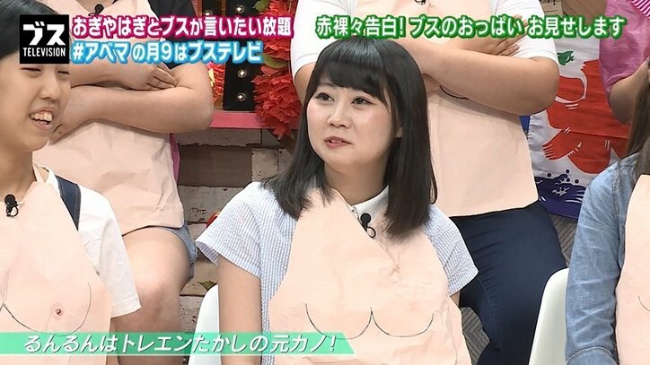 わたなべるんるん、元カレ・トレエンたかしのパンツを未だに保存 「ジップロックに入れて」 2019/03/15 09:36 拡大する 17日、おぎやはぎの小木博明と矢作兼がAbemaTV(アベマTV)でMCを務めるトークバラエティ『おぎやはぎの「ブス」テレビ』(毎週月曜21時~)が放送され、M-1王者トレンディエンジェル・たかしの元カノであるわたなべるんるんがおっぱいを“公開”。おっぱいにまつわる、たかしとの思い出を語った。 この日は「ブスのおっぱい」をテーマに、一同が肌色の紙エプロンに自身のおっぱいを描いて登場。以前の放送で「たかしと同棲した挙句、夜逃げされた」と明かしたわたなべは、おっぱいを見せながら「乳首が小さくて色が薄く、遠目から見たら乳首がないんです」と告白した。 続きを読む