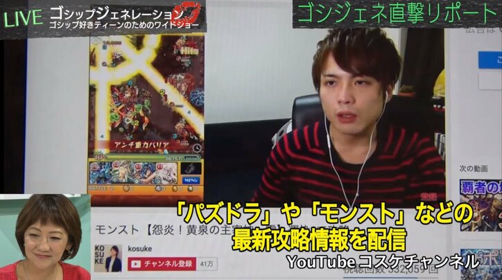 現在YouTuberの数は最低でもおよそ3万9千人いると言われており、チャンネル登録数のランキングでコスケはなんと109位。トップYouTuberの1人だ。番組では、パズドラをプレイする様子を実況してみせ、その驚異的なスピードにスタジオ中が驚嘆。