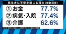 佐藤さんたちのように人生を謳歌している高齢者がいる一方、老後に不安を覚える人は少なくない。長生きすることについて、東京海上日動あんしん生命保険の「"長生き"に関する意識調査」(2010年)では、「非常に不安を感じる」が25.1%、少し不安を感じるが60.6%と、実に7割以上の人が不安を感じているという結果が出ている。また、不安を抱く理由については、1位=お金(77.7%)、2位=病気・入院(77.4%)、3位=介護(62.6%)となっている。