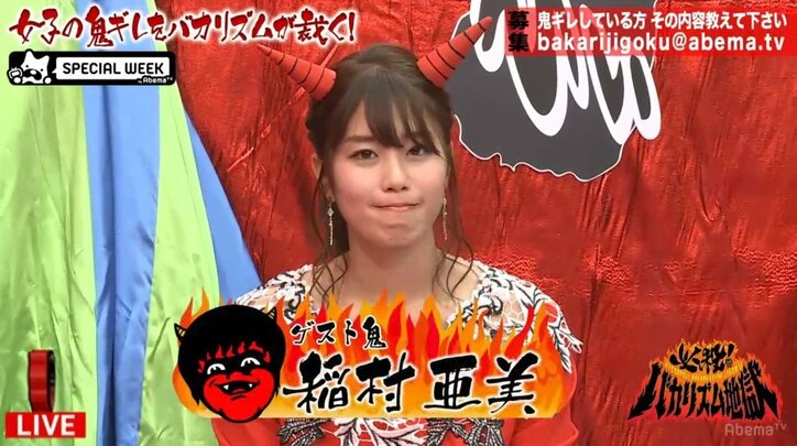“神スイング”稲村亜美、来年への願望を語る「球団全制覇したい」 2019/10/24 21:28 拡大する AbemaTV(アベマTV)の「AbemaSPECIALチャンネル」にて、『必殺!バカリズム地獄』♯20が9月22日(金)夜9時から生放送された。同番組は、“ヤンキー鬼”に扮したお笑い芸人・バカリズムが、様々な女性たちが経験した“鬼ギレ”エピソードを吟味していく1時間のレギュラー番組だ。今回は、ゲストにタレントの稲村亜美、グラビアアイドルの手島優、タレントの山根千佳、モデルの梨衣名を迎え放送された。 続きを読む
