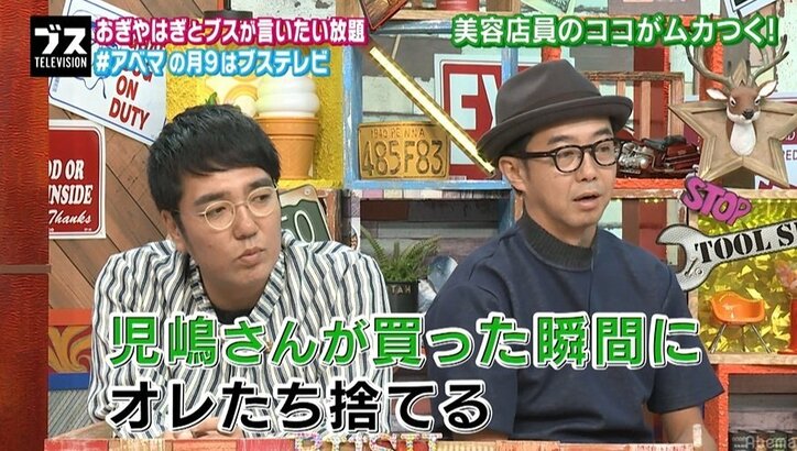 おぎやはぎ、アンジャ児嶋のマネ癖にうんざり「一気にそのブランドがダサく思える」 2019/03/15 09:37 拡大する 9日、おぎやはぎの小木博明と矢作兼がAbemaTV(アベマTV)でMCを務めるトークバラエティ『おぎやはぎの「ブス」テレビ』(毎週月曜21時~)が放送され、おぎやはぎの2人が所属する「プロダクション人力舎」の面々が、同事務所のタレント・アンジャッシュ児嶋一哉のある行動に辟易していることを明かした。 おぎやはぎの2人いわく、児嶋は人の持っているものをすぐマネすると言い、しかもそれをなんとも思わないのだそう。「財布とか服とか、『それいいね、どこの?』と聞いてきて、(色もデザインも)全く同じものを買われる」「遊んでいる時に洋服が被る。本人はそれを恥ずかしいと思っていない。それが嫌」と語った。 続きを読む