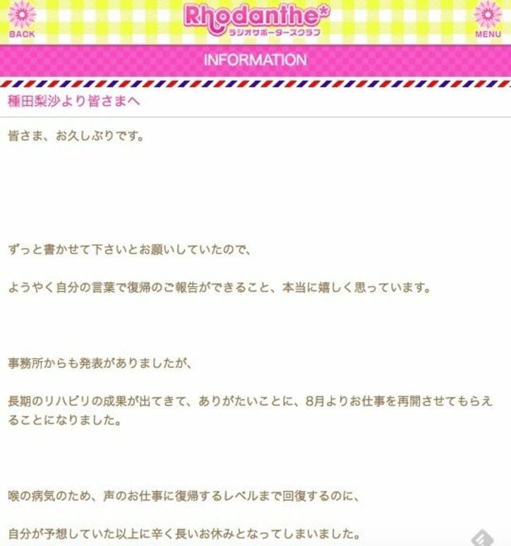 声優・種田梨沙さん、復帰発表後初コメント「ただいま!!」 2019/03/15 09:37 拡大する 声優の種田梨沙さんが、自身の所属するスペシャルユニット「Rhodanthe*」のサイトにて、自らの復帰を報告した。(スペシャルユニット「Rhodanthe*」公式サイトよりスクリーンショットより) 2016年に喉の病気のため、活動休止を発表していた種田さん。「皆さま、お久しぶりです。ずっと書かせて下さいとお願いしていたので、ようやく自分の言葉で復帰のご報告ができること、本当に嬉しく思っています。事務所からも発表がありましたが、長期のリハビリの成果が出てきて、ありがたいことに、8月よりお仕事を再開させてもらえることになりました」と復帰を自らの言葉で報告した。 続きを読む 2025秋アニメ(10月クール) 作品情報 もっとみる(74) キミと越えて恋になる 羅小黒戦記 ウマ娘 シンデレラグレイ 第2クール 千歳くんはラムネ瓶のなか 藤本タツキ17-26 シルバニアファミリー フレアのワンダーデイズ