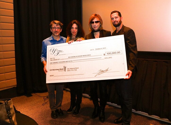 現地時間10月9日夜、YOSHIKIはニューヨークにて、米・保健社会福祉省でシニアディレクターを務める臨床ソーシャルワーカーのジェニファー・レフに小切手を手渡した。この寄付金はYoshiki Foundation America 501(c)(3)<米・正式非営利団体>を通じて、直ちにMusiCares©が現在行っているハリケーン救援活動に充てられる。(写真は左から:Nick Cucci、レコーディングアカデミーニューヨークチャプター エグゼクティブ・ディレクター/Jennifer Leff、MusiCares© 社会福祉部門 シニアディレクター/YOSHIKI/Adam Block、米ソニーレガシーレコーディング社長)
