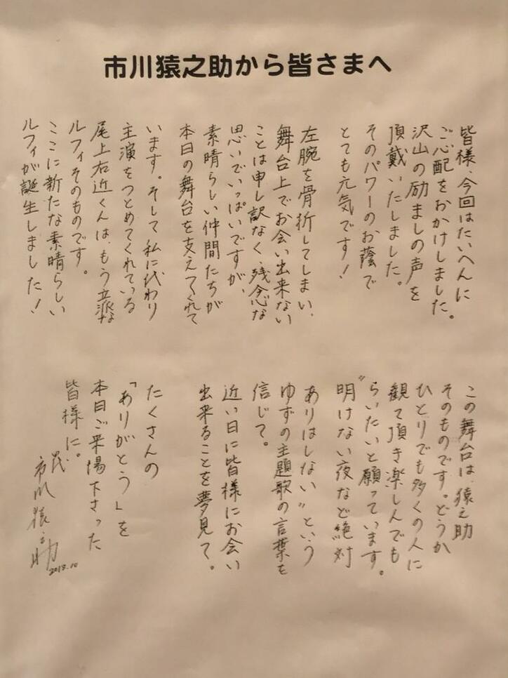 スーパー歌舞伎II『ワンピース』で負傷・降板の市川猿之助、手書きメッセージを公開「この舞台は猿之助そのものです」 2019/10/24 21:28 拡大する 歌舞伎俳優の三代目市川右團次が22日、スーパー歌舞伎II『ワンピース』のカーテンコールの途中に左腕を骨折し現在休演している、四代目市川猿之助から観劇客への手書きのメッセージを自身のブログで報告した。 三代目 市川右團次 / 二代目 市川右近オフィシャルブログより 白ひげ役で同舞台に出演している市川は「今日も昼の部出演のタケル…」とチョッパー役で出演している息子のタケルくんのメイク前の写真を公開。続けて「楽屋入りしたら…猿之助さんから…グミのプレゼント」と今度はメイク後で衣装を着たタケルくんの写真を公開。「チョッパーTシャツは…声優の…平田広明さんから…サンジやジャックスパロウの声優さん!ありがとうございました…タケル、良かったね」とつづった。 続きを読む