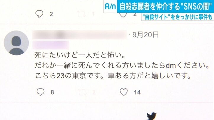 「死にたいけど一人だと怖い。だれか一緒に死んでくれる方いましたらdm(ダイレクトメール)ください」。行方がわからない八王子の女性がツイッターに投稿したこの書き込みが、白石隆浩容疑者と接点を持つきっかけとなった。