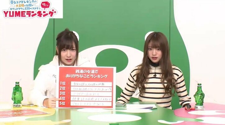 11月16日に放送された映像配信プラットフォーム「FRESH!」のバラエティ番組「夢みるアドレセンスの王様のお願いカウントダウン王国ベストテン~略してYUMEランキング~」で、2人は銭湯と父親との入浴についてトーク。小さい頃からよく銭湯に連れて行ってもらっていたという京佳は、小学1年生まで男湯で入浴していたという。「なんか見たことある男の子いるなって思ったら、同じクラスの男の子で! こっち裸な訳じゃん。それからはお母さんと一緒に入ろうと思った」と京佳は幼いながらに、恥ずかしい思いをした銭湯でのエピソードを語った。