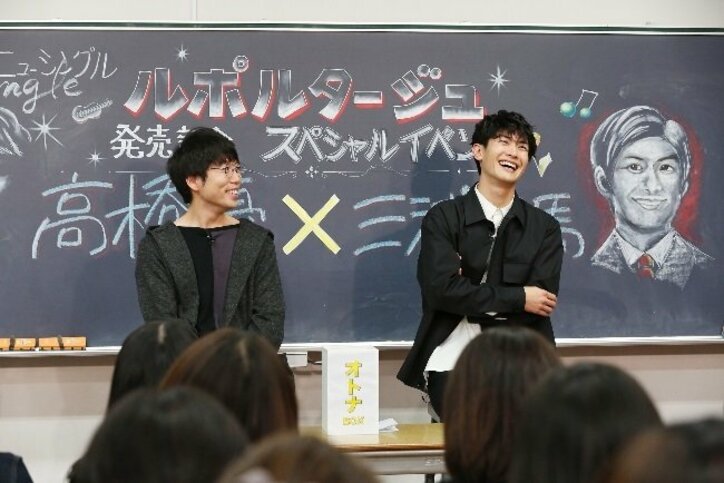 “高橋優×三浦春馬『オトナ高校』SPイベント” を女子校の教室で開催 激レアイベントに当選者70名が大興奮 2019/10/24 20:39 拡大する シンガーソングライター高橋 優が、18枚目のニューシングル「ルポルタージュ」の発売を記念して、スペシャルイベントを11月25日(土)に都内の女子高校で開催した。 「ルポルタージュ」は現在、毎週土曜23:05~放送中のテレビ朝日系土曜ナイトドラマ『オトナ高校』の主題歌として起用されており、この発売記念スペシャルイベントには高橋 優だけでなく、ドラマの主演を務める三浦春馬も駆けつけ、ドラマ『オトナ高校』にちなみ、実際の高校の教室にシングル購入応募者3500名の中から当選者70名(うち20名は応募者殺到につき追加当選で授業参観形式の立ち見参加)が招待され、ドラマの主演、主題歌を務める二人がドラマから飛び出して、間近で見ることが出来る激レアなイベントとなった。当初、当選者限定イベントの予定だったが、応募者多数により、急遽、abemaTVで生配信も行われた。 続きを読む