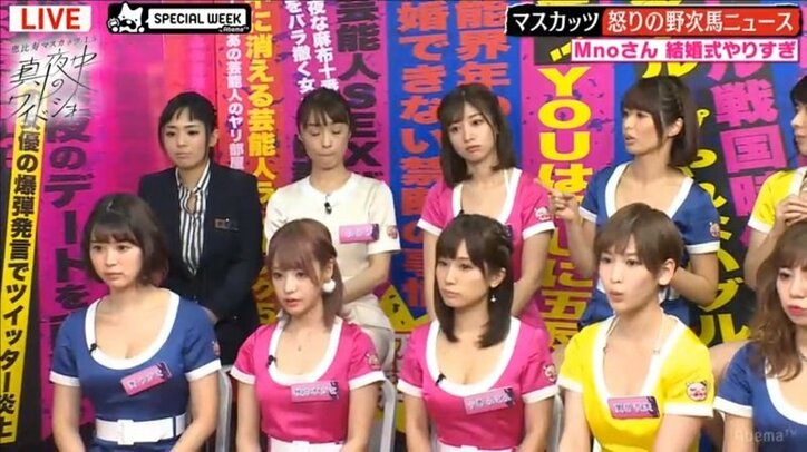 恵比寿マスカッツ・川上奈々美、「misono、7回の結婚式」報道に怒り爆発 2019/03/15 09:37 拡大する 24日に恵比寿マスカッツ1.5のメンバーによる新番組「恵比寿マスカッツ 1.5 真夜中のワイドショー」が放送された。MCにオアシズ、森三中の黒沢かずこがADを担当し“セクシー事件簿”をマスカッツなりに大体で討論する大人なワイドショー番組だ。 マスカッツのメンバーが最近腹が立った巷のニュースを討論していく新コーナー「マスカッツ 怒りの野次馬ニュース」で、川上奈々美は「Mnoさん結婚式やりすぎ問題」を議題にあげた。 続きを読む