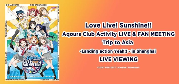 Aqours、初の上海単独LIVE&ファンミーティングを映画館で完全生中継 ライブ・ビューイング開催決定 2019/03/15 09:37 拡大する 2018年1月20日(土)、中国・上海静安体育中心アリーナで開催される、Aqours初の上海単独LIVE&FANMEETING「Love Live! Sunshine!! Aqours Club Activity LIVE & FAN MEETING Trip to Asia -Landing action Yeah!!-」を、全国各地の映画館でライブ・ビューイングすることが決定した。 オールメディアで展開するスクールアイドルプロジェクト「ラブライブ!」シリーズの1作『ラブライブ!サンシャイン!!』を担うスクールアイドルグループ「Aqours」の国内外を巡るLIVE & FAN MEETINGが上海でも開催されることとなった。 続きを読む 2025秋アニメ(10月クール) 作品情報 もっとみる(74) うごく!ねこむかしばなし コアラ絵日記 終末のワルキューレ 3期 転生悪女の黒歴史 とんでもスキルで異世界放浪メシ2 味方が弱すぎて補助魔法に徹していた宮廷魔法師、追放されて最強を目指す