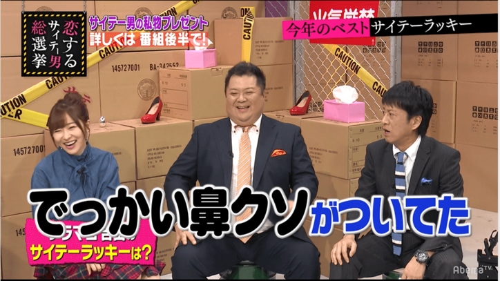 ブラマヨ吉田、鼻クソをつけたまま番組収録 指原莉乃&ブラマヨの恋するサイテー男総選挙 2019/03/15 09:37 拡大する 26日、HKT48の指原莉乃と、ブラックマヨネーズの小杉竜一、吉田敬がAbemaTV(アベマTV)でMCを務める『指原莉乃&ブラマヨの恋するサイテー男総選挙』(毎週火曜よる9時~)が放送され、トークテーマ「今年のベストサイテーラッキー」で、吉田が情けないサイテー話を披露した。 吉田は「今年、2、3回あったこと」と前置きし、「テレビ番組の収録が終わってから鏡を見たら、でっかい鼻クソがついてた」と告白。鼻クソがついたままの状態で、何度も公共の電波に乗ってしまったことを明かした。 続きを読む