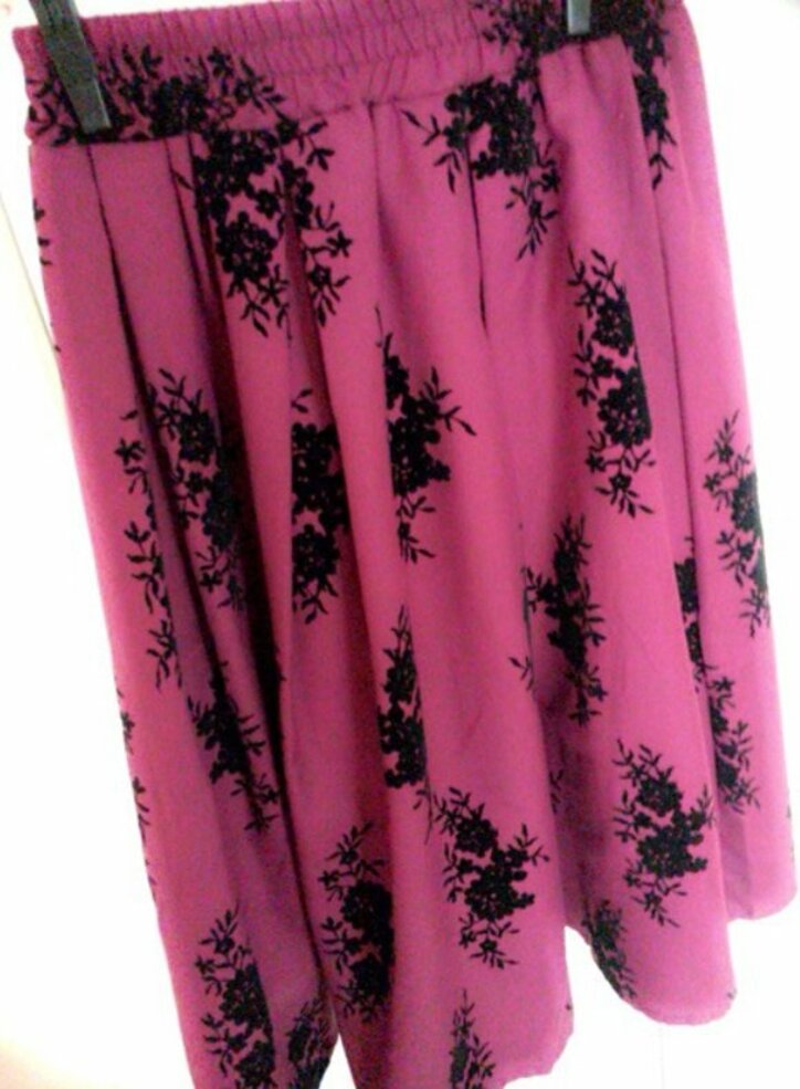 「このボルドーのフロッキープリントスカートはミモレ丈で、程よいフレア感です 同じ形のスカートが、色違い、柄違いで沢山あるので、15分くらいあれこれ迷って決めた1着です」というコメントとともに写真つきで紹介したのは、ボルドーに黒い花柄があしらわれた膝丈ぐらいのスカート。スカートの他にも、900円だったという黒のシャギーニットも紹介した。