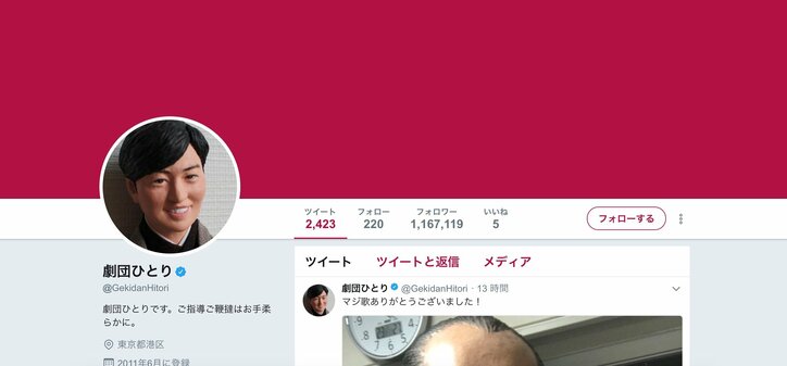 劇団ひとり、クオリティの高すぎる“片岡鶴太郎メイク”が大反響「最高!」「めっちゃ笑った」 2019/10/24 21:28 拡大する (劇団ひとり公式twitterより) お笑い芸人の劇団ひとりが1月1日、あまりにクオリティの高すぎる“片岡鶴太郎メイク”でのセルフショットを公開。その驚きの出来栄えが、ネット上で大きな話題となっている。 マジ歌ありがとうございました! pic.twitter.com/uS02nghikh これは同日、劇団ひとりが自身の公式twitterに投稿したもので、この中で彼は、「マジ歌ありがとうございました!」と自身が出演したテレビ東京系のバラエティ特番『ゴッドタン新春SP 芸人マジ歌選手権』(元旦夜放送)について報告しつつ、その際に披露した片岡鶴太郎の“なりきり特殊メイク”姿をセルフショットで公開。 続きを読む