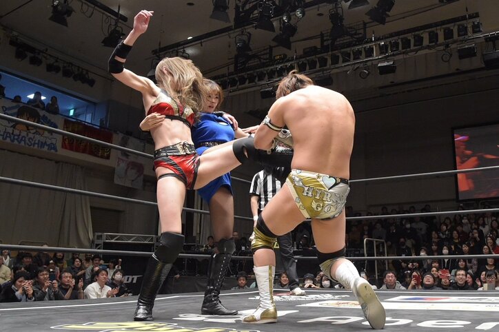 赤井沙希と葉加瀬マイ、ダブルキック「びっくりするくらいセクシーな場面見て」 2019/10/24 23:25 拡大する DDTの2018年第1弾興行となる後楽園ホール大会が、1月3日に開催された。豪華メンバーがエントリーしているリーグ戦・D王グランプリが5日からスタートするだけに、その前哨戦的な意味合いの試合も多く組まれていた。そんな中、DDTらしい企画性重視の試合も。その一つが「インフォマーシャルマッチ」KUDO&坂口征夫&赤井沙希vs大鷲透&平田一喜&ベーダ・スコット。インフォマーシャルマッチとは、商品などの告知を目的としたDDTの名物企画。この日は赤井、坂口も出演している映画『LADY NINJA~青い影~』(1月20日より渋谷ユーロライブ他で公開)がテーマで、赤井チームには主演の葉加瀬マイがセコンドについた。 続きを読む