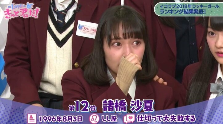 最下位の12位となってしまった諸橋沙夏もまた、眼を真っ赤にして泣き出した。運気が落ちている諸橋に、ラブちゃんが「グラビアのオファーが来ます」と開運方法を告げると、諸橋は「それやると良いんですよね? 事務所がオッケーならもっとやります!」と泣きながらも冗談めかしてグラビア宣言をした。