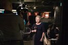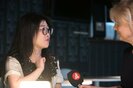 「TV4」のレポーターであるエリザベートに英語で応じる津田プロデューサー。取材が始まるとさっそく「#MeToo」の話題が出た。
