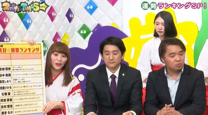 スパガ宮崎理奈が今年で卒業? 占い結果に本人も驚き「私、いなくなるの?」 2019/03/15 09:37 拡大する アイドルグループ・SUPER☆GiRLSの宮崎理奈に、ラスト陰陽師こと橋本京明から驚きの占い結果が告げられた。 1月19日に放送された映像配信プラットフォーム「FRESH!」の「スパガ TIMES☆GOLD」に、陰陽師の末裔・橋本京明とディグラム診断の木原誠太郎が出演。スパガメンバーの2018年の運勢ランキングが発表された。橋本はハッキリとした物言いと、細やかなアドバイスでメンバーの運勢を次々と発表していった。 続きを読む