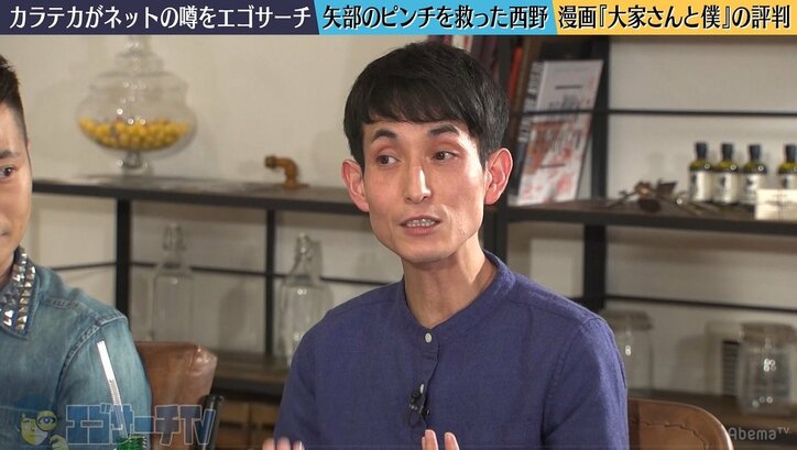 カラテカ・矢部、漫画『大家さんと僕』が反響 誕生秘話を明かす 2019/03/15 09:37 拡大する AbemaTV(アベマTV)のAbemaSPECIALチャンネルで毎週金曜夜10時から放送中の『エゴサーチTV』(1月26日放送回)に、お笑いコンビ・カラテカの入江慎也、矢部太郎がゲスト出演した。 “エゴサーチ”とはインターネット上で、自身の名前などを検索して自分自身の評価を確認する行為のこと。本番組は、“エゴサーチ”が得意なお笑いコンビ・キングコングの西野亮廣が番組MCを務め、毎週迎えるゲストと一緒に、ゲストに関する“エゴサーチ”をしながらインターネットで出てきた情報や噂などについて、嘘か本当かジャッジし、訂正していく1時間のトークバラエティ番組だ。 続きを読む