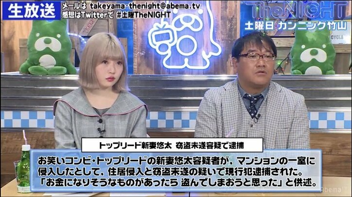 トップリード新妻が参加していた「LINEグループ」 キンコメ高橋もメンバーだった 2019/03/15 09:37 拡大する 27日、「カンニング竹山の土曜The NIGHT」(AbemaTV)が放送された。同番組では、その週に起こったさまざまなニュースを独自の視点で読み解き、ワイドショーなどで発言した竹山自身のトークも振り返るコーナーや、竹山が“今、話してみたい”話題の人物をスタジオに招き、ゲストにまつわるさまざまな情報や噂の真相について語っていく。 1週間で起きた話題の出来事を振り返る中で、お笑いコンビ・トップリードの新妻悠太容疑者が、窃盗と建造物侵入の疑いで逮捕された件に触れた竹山。しかし、アシスタントMCのスパローズ・大和一孝が、キャンプ好きによって結成した「焚火会」という集まりでLINEグループを作っており、そこに新妻容疑者が名を連ねていたことを激白した。 続きを読む