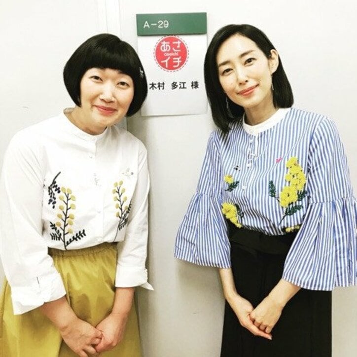 たんぽぽ川村 仲良し・木村多江と偶然そっくりな衣装で「双子コーデ」2ショット 2019/10/24 21:29 拡大する お笑いコンビ・たんぽぽの川村エミコが6日、自身のアメブロを更新し、女優の木村多江との2ショットを公開した。 たんぽぽ川村エミコオフィシャルブログより この日、情報番組『あさイチ』(NHK)にゲスト出演していた川村。ギネスにも「世界一長い」と登録されている愛知の守口大根や、オリンピックを控えた韓国の様子などが特集されていたこの日の放送には、同じく木村もゲストとして出演した。 その木村について川村は、「四年前、初めてロケでご一緒させていただいてから、ご飯にご一緒させていただいていたりして、仲良くさせていただいております」と親交があることを説明。さらに、「多江さんとお写真です。双子コーデ??!」というコメントと共に公開した写真では、共に可愛らしいお花の刺繍が施されたシャツを着用しており、川村も「偶然の似ているブラウスに嬉しくなっちゃいました」と語っている。 続きを読む
