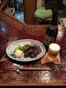 飲み物はビール、芋焼酎「白金乃露」、そしてハイボールのみ。アテは地鶏の炭火焼き、山芋のステーキ、そしてハムエッグ。夜中に酒の肴として味わうハムエッグは絶品です。