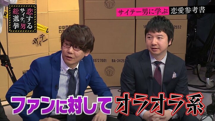 三四郎・相田のファン対応は「オラオラ系」 小宮が暴露 指原莉乃&ブラマヨの恋するサイテー男総選挙 2019/03/15 09:37 拡大する 2月20日、HKT48の指原莉乃と、ブラックマヨネーズの小杉竜一、吉田敬がMCを務める『指原莉乃&ブラマヨの恋するサイテー男総選挙』#42(毎週火曜よる9時~)がAbemaTV(アベマTV)にて放送され、三四郎の小宮浩信と相田周二がゲスト出演した。 20日放送回の冒頭で、相田が「優しい顔をしているが、女性にはオラオラ系」と紹介されると、小宮は「ファンに対してオラオラ系」であると訂正。出待ちをしているファンに相田の方から声をかけ、「おい!何でこの間(ライブに)来なかったんだよ」と、強い口調で責めるような場面があったという。ファンの女性が「仕事で来られなかった」などと言っても、「俺ら新ネタだったぞ」と強気に出ていたそうだ。 続きを読む