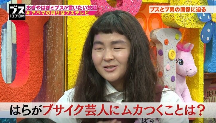 まるで別人に見えるほどのメイク術が、“詐欺メイク”として話題を呼んでいるはら。“ブス枠”の女性ゲストたちが、“ブ男”に腹が立ったエピソードを披露する中、はらは「周りの先輩方にムカつきますね」と打ち明けた。