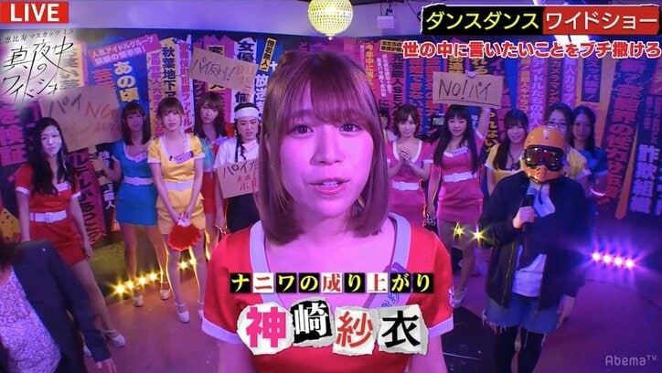 今週も、マスカッツメンバーが日頃は言えない、世間に対する不満を叫ぶ名物コーナー「ダンスダンスワイドショー」のコーナーからスタート。共演者に対する不満、花粉症でイラついている心境などを思い思いに叫ぶ中、神崎紗衣がカメラの前に躍り出た。