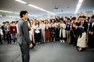 新入社員による携帯電話での写真撮影やSNS上へアップすることは禁止とアナウンスされていたが、三浦は「なんでダメなんですか? ここ、ネットの会社だよ。ドラマのハッシュタグをつけて、どんどん上げてもらいましょうよ!」と笑顔で許可を出すと、新入社員たちからは喜びの声が。最後はサイバーエージェントの代表取締役であり、本ドラマの原案となった「渋谷で働く社長の告白」の著者である藤田晋氏、そして新入社員とともに写真撮影を行った。