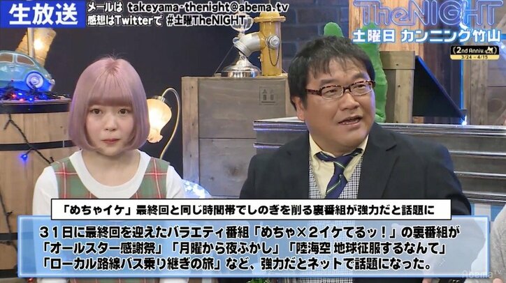カンニング竹山、裏番組の“めちゃイケ最終回潰し”に複雑な胸中を明かす 2019/03/15 09:37 拡大する 3月31日深夜、『カンニング竹山の土曜The NIGHT』(AbemaTV)が放送された。 同日に『めちゃ×2イケてるッ!』が22年の放送に幕を下ろしたが、竹山は18年ぶりに復活した「七人のしりとり侍」に出演しており、番組冒頭に続いて中盤でもこの話題に触れた。 竹山は「『めちゃイケ』今日最終回だったけどさ、テレビって会社の戦いだなって思ったのはさ」と切り出して「あれだけ長い時間やって『めちゃイケ』が最終回じゃない?でもはTBSは『感謝祭』ぶつけてくる、日テレは『月曜から夜ふかし』ぶつけてくる、テレ朝は『陸海空』ぶつけてくるとかさ、テレ東は『ローカル路線バス乗り継』ぶつけてくる」と、『めちゃ×2イケてるッ!』の放送時間帯に各局が強力な裏番組を放送していたことに言及する。 続きを読む