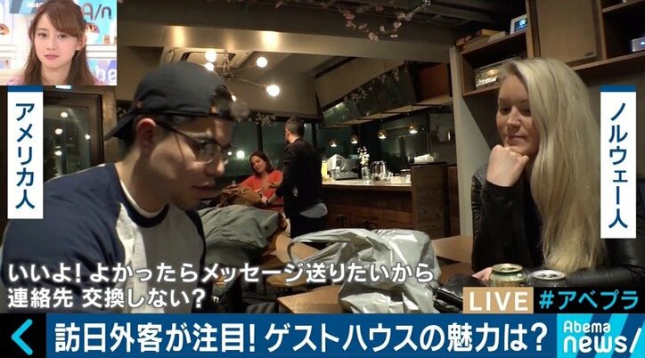“民泊新法”で注目、元キャリア官僚も手がける「ゲストハウス」とは 2018/04/07 01:00 拡大する 昨年は2800万人を超えた訪日外国人。今、彼らの宿泊事情が転機を迎えているという。シティーホテルやビジネスホテル、旅館、そして話題の民泊がある中、その土地の生活を感じることができる点、様々な国からの旅行者と仲良くなれる点から外国人に人気なのが「ゲストハウス」だ。海外ではホステルとも呼ばれ、一昔前までは安宿のようなイメージでしかなかった。 渋谷にある「WISE OWL HOSTELS SHIBUYA」を取材すると、基本的に寝室は相部屋で、狭い通路の両側にはカーテンで仕切られた2段ベッドがずらりと並んでいた。宿泊料金は1泊4570円(取材日)。また、ラウンジでは週に1度"国際交流パーティー"が開かれている。アメリカ人の男性は「人に出会えるのがいい。特に1人旅だと圧倒的に楽しい。民泊だと1人では何もすることがない」と話す。 続きを読む