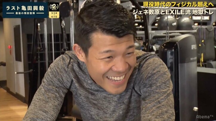 亀田興毅、復帰戦に向け“EXILEトレ”敢行 心拍数約200まで追い込み「根性しかない」 2019/10/24 20:09 拡大する 現役復帰に向けてトレーニング中の、ボクシング元3階級王者の亀田興毅(31)が、1試合限りの復帰戦まであと1カ月という中、新たな刺激を体に与えるべく「EXILEトレ」を敢行した。 4月7日に放送されたAbemaTVのドキュメンタリー番組「ラスト亀田興毅~最後の現役復帰~」で、7人組のダンス&ボーカルユニット「GENERATIONS from EXILE TRIBE」のメンバー、数原龍友(25)とともにジムに向かい、普段からEXILEのメンバーが取り組んでいるトレーニングに挑戦。過酷なサーキットトレーニングに「しんどい…」と言いつつも、心拍数を200に迫る194まで自らを追い込み「根性だけでやってきたんで」と、周囲の度肝を抜いた。 続きを読む