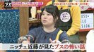 「本当にあったブスの怖い話」をテーマにスタジオでは、近藤がエピソードを披露。「私の知り合いで、恋愛経験が全く無い子がいて、その子がある先輩の事を好きになった。恋愛経験が無いから、みんなで相談にのってあげて、『今度の飲み会で頑張りなよ』と話していた。その仲間内に肉食系のブスがいて、何故か飲み会の席で、そのブスが先輩の隣をずっとキープして誘惑していた。“みんなで応援しているのに、お前は何やっているんだ!”という空気になって…。そしたら途中で、2人が抜け出して、次の日にどうなったのか聞いたら、『キスを迫られて、チューだけして帰った』と偉そうに言われた。大嫌いになりました!」と明かした。