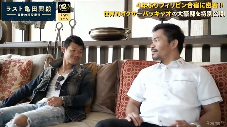 亀田興毅、6階級王者パッキャオと夢の対談で質問攻め「自分が憧れていたボクサー」 2019/10/24 20:09 拡大する 5月5日に1試合限りの復帰戦を行うボクシングの元3階級王者・亀田興毅(31)が、フィリピン合宿で憧れのボクサー・マニー・パッキャオ(39)と夢の対談を果たした。史上2人目の6階級王者となった伝説的なボクサーに、亀田もやや緊張の面持ちで対談すると、終始質問攻めに。約2年半ぶりの復帰に向けて、これ以上ない刺激を受けた。 パッキャオと言えば、ボクサーさらにはボクシングファンであれば、知らない人はいないほどの世界的な英雄。2015年に行われた5階級王者フロイド・メイウェザーとの世紀の対決は、判定で敗れはしたものの、世界規模で注目を浴びた。2017年7月にWBO世界ウェルター級王座から陥落したが、現在は1年ぶりのカムバックに向けトレーニングを積み、さらに政治家としても活動している。 続きを読む
