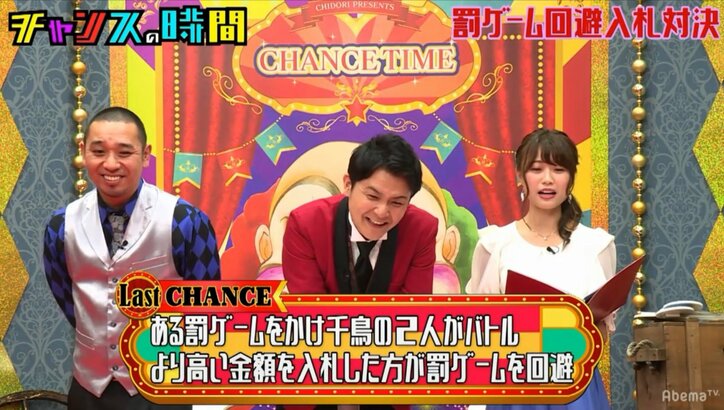 千鳥、罰ゲーム回避のために相方の裏切り合い! 保身のためにウソ申告 2019/03/15 09:37 拡大する AbemaTVで5月1日に放送された、お笑いコンビ・千鳥がMCを務めるバラエティ「チャンスの時間」で、千鳥の2人が「罰ゲーム回避入札対決」に挑戦した。 同企画は、より多く入札した方が罰ゲームを回避できるというもの。肝心の罰ゲームは“ADによるペットボトルビンタ”だった。この罰ゲームを聞いたノブは「ペットボトルで頭をカーンって殴るの?プラスチックだからカラーバットと一緒じゃ」と眉をひそめ、大悟は「ただの暴行」と難色を示した。 続きを読む