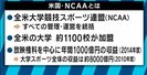 NCAA(全米大学体育協会)とは、大学スポーツを管理・統括している団体で、全米の大学約1100校が加盟。大学スポーツ全体の収益約8000億円(2010年度)のうち、放映権料を中心に年間1000億円の収益(2014年度)が活動原資になっているという。