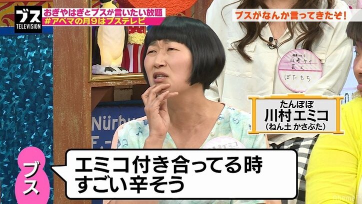 たんぽぽ川村、破局時に言われた屈辱的な言葉 2019/03/15 09:37 拡大する おぎやはぎの小木博明と矢作兼がMCを務めるトークバラエティ『おぎやはぎの「ブス」テレビ』#70(毎週月曜よる9時~)が6月4日、AbemaTV(アベマTV)にて放送。たんぽぽ・川村エミコが、ブスに言われた屈辱的な言葉を明かした。 トークテーマ「ブスがなんか言ってきた!」で、川村は彼氏と別れた後にあるブスに言われた「別れて良かったよ。付き合ってる時、すごい辛そうだったから」「全然幸せそうじゃなかった。今すごいスッキリしてる」という言葉を紹介。「お前が言うなよ!」と、分かったようなことを言うブスにムカついたことを明かした。 続きを読む