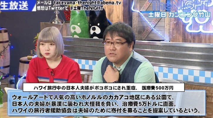 カンニング竹山、「ハワイはただの楽園じゃない。基本的に安全な場所ではない」 2019/03/15 09:37 拡大する 9日深夜、『カンニング竹山の土曜The NIGHT』(AbemaTV)が放送された。 1週間の話題を振り返る中で、竹山はハワイ旅行中の夫婦が暴漢に襲われ大けがを負い、5万ドルという多額の医療費を払うことになった事件に触れる。 事件が起きたホノルルのカカアコ地区は現在ウォールアートが人気で、“インスタ映え”することもあって観光客が多く訪れているが、竹山は「基本忘れちゃいけないのは、ハワイはアメリカです。安全な場所ではないです、基本的に」と警鐘を鳴らした。 続きを読む
