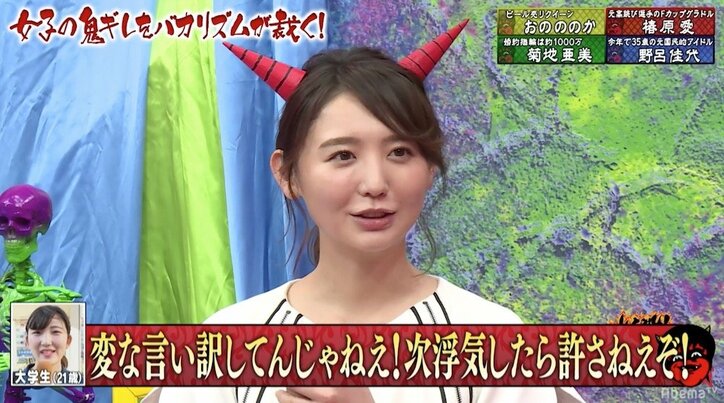 「浮気した上に言い訳した彼氏を地獄に落として欲しい」という街の声が紹介されると、おのののかは「私すごい許しちゃうタイプ」と自ら告白。
