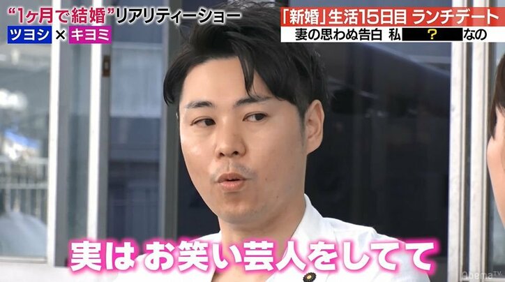 7月2日(月)よる11時~、AbemaTV(アべマTV)のAbemaSPECIALチャンネルにて“新感覚お見合いリアリティーショー”『いきなりマリッジ』#4が放送され、出会ったその日のうちに同棲を開始したツヨシ(33)とキヨミ(28)のカップルが、新婚生活15日目にして激しく対立。言い争う中でキヨミは、自身の“もう1つの顔”を打ち明けた。