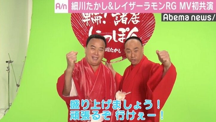 細川たかし&レイザーラモンRGがMV初共演 “羽生結弦”に“イニエスタ”も 2018/07/04 08:16 拡大する 6月15日に発売した演歌歌手・細川たかし(68)の新曲「輪!諸居にっぽん」のミュージックビデオが完成し、細川のものまねで話題のお笑い芸人・レイザーラモンRG(44)とミュージックビデオで初共演した。 今回の新曲は、細川の歌とパワーで「日本を元気にする」がテーマ。ミュージックビデオは全編CGで制作され、お祭りの風景に派手に花火が上がるなど明るくポップな映像になっている。 さらに、細川から「こぶしたかし」の芸名をもらったRGが、フィギュアスケートの羽生結弦選手、ヴィッセル神戸に新加入するイニエスタ選手、ロシアのプーチン大統領など得意のモノマネを披露。師匠のミュージックビデオを盛り上げている。 続きを読む