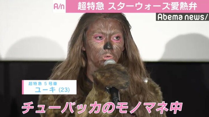 超特急、チューバッカのコスプレで『スター・ウォーズ』愛を熱弁 “鳴き声モノマネ”も披露 2018/07/05 09:14 拡大する 映画『ハン・ソロ/スター・ウォーズ・ストーリー』の公開記念イベントが4日に都内で行われ、6人組ボーイズグループ・超特急のメンバー4人がチューバッカに扮し登場した。 ユースケ(22)は「やっぱり僕は宇宙を舞台にした壮大なストーリーの中に描かれる愛の物語にすごい惹かれました。『愛しているわ』『知ってるさ』のシーンは泣かずにはいられない」とコメント。 イベントでは、チューバッカのモノマネが得意というユーキ(23)が鳴き声を披露し、会場を盛り上げる場面もあった。 続きを読む