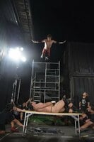 MAOにとっては2度目の“犯行”。その後も会場外の自販機からダイブ、樋口の肛門を爆破、顔面に花火攻撃と異様なテンションで暴れまくるMAO。竹下もいつも以上のテンションで、駐車場に組まれたイントレ(ヤグラ)からのテーブルクラッシュ・ボディプレスを敢行してみせた。