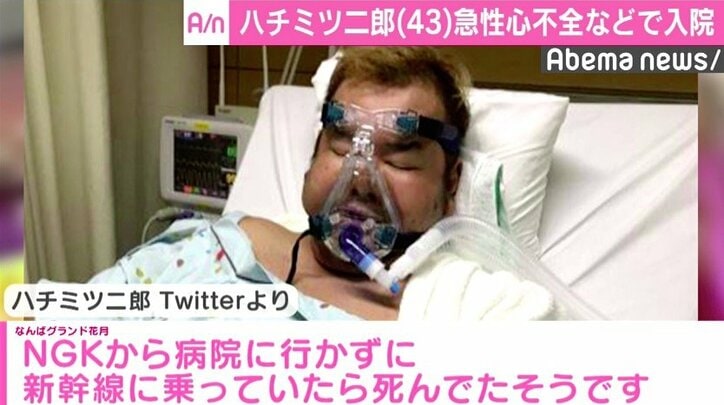 ハチミツ二郎、呼吸器姿の写真を公開「新幹線乗っていたら死んでた」 2018/07/18 06:01 拡大する お笑いコンビ・東京ダイナマイトのハチミツ二郎(43)が「急性心不全」「急性呼吸不全」「肺炎」のため入院したことを、17日、所属事務所が発表した。 ハチミツ二郎は16日、大阪なんばグランド花月で行われた公演に出演後、体調不良を訴え、大阪市内の病院に搬送。そのまま入院となった。医師からは「数日前から続いていた高熱が原因で肺炎を発症し、心臓に負担がかかり、肺に水がたまったことで急性心不全、呼吸不全を引き起こした」と診断を受けたという。 続きを読む