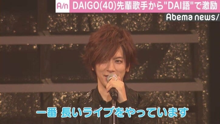 DAIGO、デビュー15周年で自身史上最長ライブ 先輩歌手から“DAI語”で激励も 2018/07/22 09:10 拡大する 歌手のDAIGO(40)が21日、東京・中野サンプラザでデビュー15周年記念ライブを開催した。 デビュー曲「MARIA」でスタートしたライブの前半は「DAIGO☆STARDUST」時代の曲を歌唱。後半からは、新曲「今夜、ノスタルジアで」など2007年にDAIGOと改名してからの曲を熱唱。新旧2つの名義で対決する二部制のステージで会場を盛り上げた。 ライブ会場に、2016年に結婚した女優の北川景子(31)の姿はなかったものの、大黒摩季(48)、倉木麻衣(35)、T-BOLANの森友嵐士(52)と、同じレコード会社の先輩たちが駆け付け、デュエット曲も披露。そして、3人それぞれが“DAI語”でDAIGOへメッセージを贈った。 続きを読む