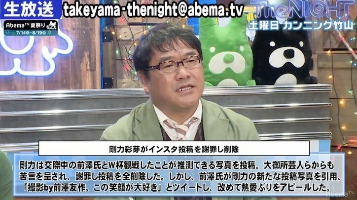 カンニング竹山、剛力彩芽のインスタ炎上問題をバッサリ 2019/03/15 09:37 拡大する 28日深夜、『カンニング竹山の土曜The NIGHT』(AbemaTV)が放送された。 「竹山の発言で振り返る 表のワイドショー」のコーナーで「剛力彩芽がインスタ投稿を謝罪し削除」の記事に竹山は注目。 剛力は今月16日にインスタグラムで、サッカー・ワールドカップに『ZOZOTOWN』の前澤友作社長と一緒に試合観戦したと思われる写真を投稿したことが議論を呼び、剛力は投稿を削除。後日、前澤氏が撮ったと思われる剛力の写真が投稿され、改めて熱愛ぶりをアピールしている。 続きを読む